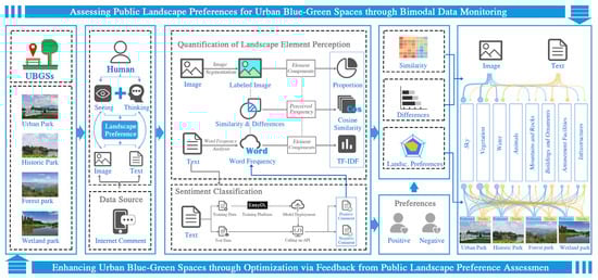Web review platforms in the Web 2.0 era embody the behaviour of subjective evaluation grounded in usage and consumption []. These platforms encourage users to evaluate and share their sentiments regarding parks or attractions by uploading photos. The user-generated comments not only convey subjective evaluations but also combine textual and visual elements, resulting in what is commonly known as “truth in images”. However, when conveying the same information, discrepancies in interpretation may emerge between image and text []. For instance, text comments reflect processed perceptual information and exhibit abstract, core, and decontextualised features []. Individual cognitive factors may limit the comprehensiveness of people’s expressions regarding environmental perceptual elements, which can lead to incomplete quantification issues. However, text comments often contain intense individual sentiment, providing a broader view of individuals’ satisfaction with UBGSs [] and the impact of the environment on their psychological well-being []. On the other hand, for photographs, intuitive visual content can serve as the primary component in photo narratives [] to visually represent public perception and compensate for the absence of linguistic expression. However, it is worth noting that the photographs within the comments represent not only people’s aesthetic appreciation of the objects but also an expression of the scene in front of them and their own feelings in a “documentary” form []. In essence, user-uploaded comment photos not only encompass positive emotions and “likes” but also serve as evidence of negative emotions and “dislikes” []. In prior studies on landscape preferences using commented photographs, researchers have often regarded the photos’ contents as aesthetic objects for the general public, emphasising the semantic information conveyed by the images while overlooking the emotional expressions in users’ comments. When exploring the public’s landscape preferences and sentiment tendencies through comment data, reliance on single modal data may be inadequate to fully extract users’ perceptual information and emotional tendencies. In this regard, text and images have certain complementary roles.