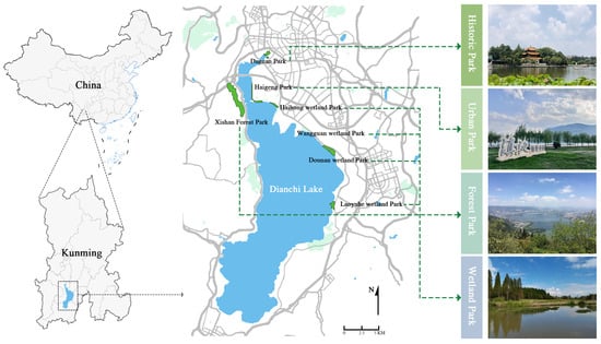 The case study encompasses 7 parks surrounding Dianchi Lake in southwest Kunming, China.