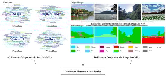 We utilised the landscape vocabulary extracted from the text data and the labels obtained from the labeled images (Figure 3) as a basis for summarising the perceptual elements of the public into two main landscape categories, including eight landscape elements and 24 element components (Table 3). The similarity between element components in text and images was measured using cosine similarity. Cosine similarity is a technique for measuring the degree of similarity between two vectors by calculating the cosine of the angle between them. A higher value implies a greater frequency of co-occurrence of an element component in both text and image modalities. In this study, we utilised keyword search to generate text vectors for multiple landscape elements, based on the generalization outcomes of the element components. If an element component is included in the text data, its corresponding position in the vector is assigned a value of 1, otherwise, it is assigned a value of 0. The same approach is used for image data, with element components in the images recognised using the image semantic segmentation technique discussed earlier and represented as the corresponding image vectors. The cosine similarity between the text and picture data is calculated as indicated by Equation (2):