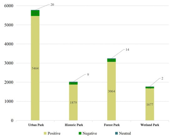 As mentioned earlier, a notable positive correlation is evident between affective restoration and landscape preference []. Moreover, positive emotions can act as indicators of perceived restorative changes []. Studies have demonstrated that visiting UBGSs can have a profound impact on the mental and physical health of attendees. For instance, individuals often encounter a sense of tranquility when exposed to natural surroundings, leading to psychological recuperation that fosters positive emotions and enhances overall well-being [,,]. Our research indicates that positive sentiments accounted for more than 93% of public evaluations of all parks, which is significantly higher than other types of sentiments (Figure 4). This finding is consistent with previous studies in other cities that have demonstrated that public perceptions of UBGSs tend to be positive. For example, Huai and Van de Voorde’s study in the cities of Shanghai and Brussels yielded similar results, and the results of surveys of public satisfaction with urban parks carried out by local governments also support this conclusion [].