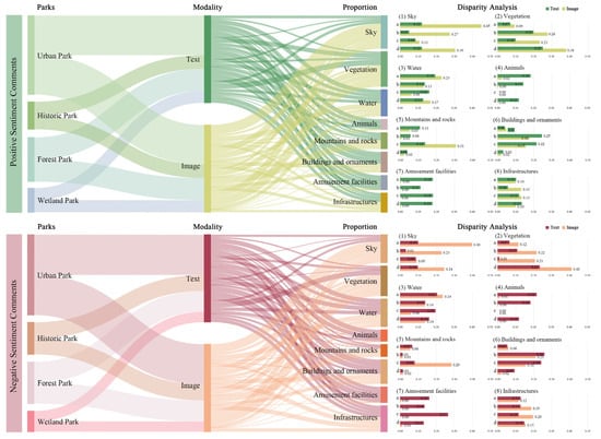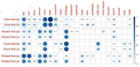 We selected element components that exhibit similarity in both image and text modalities (Figure 5). Higher cosine similarity values indicate greater similarity, whereas values close to zero suggest a lack of significant similarity. The element components’ cosine similarity for each park category showed variations under different sentiment tendencies. Under a positive sentiment tendency, urban parks exhibit higher similarity in birds (1.000), water (0.786), and sky (0.649), whereas historic parks show higher similarity in buildings (0.683) and flowers (0.589). Forest parks display high similarity in buildings (0.853), water (0.712), and cable cars (0.586), while wetland parks show high similarity in the sky (0.767), trees (0.783), water (0.733), and flowers (0.537) in both image and text modalities. In contrast, in parks with a negative sentiment trend, urban parks show a higher similarity with water (0.805) and birds (0.767), followed by the sky (0.511). Historical parks display the highest similarity with buildings (0.670). In forest parks, buildings (0.824) and water (0.683) show higher similarity, while in wetland parks, the highest similarity was observed with the sky (0.625), flowers (0.676), and buildings (0.525). These findings suggest that the occurrence of these element components is similar in both modalities.