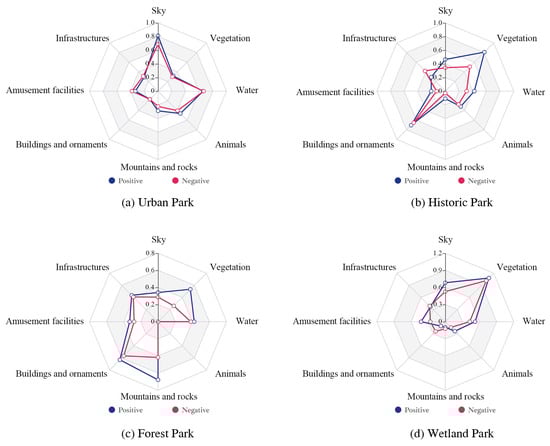 We computed the landscape element preference scores for each park type by aggregating the element component scores based on landscape element classification. Then, we analysed the perceived preference characteristics under positive and negative sentiment tendencies (Figure 7). In general, there were notable variations in the perceived landscape characteristics across the four park types. Perceived characteristics remained fairly consistent across positive and negative sentiments. Through the analysis of textual comments and photographs, we can gain a clear and intuitive understanding of the public’s preferences and dislikes for the different landscape elements in different park types.