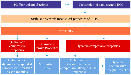 However, to date, research on the mechanical response of PE–EGC under high strain rates has been limited. It is worth noting, particularly, the difference in wettability between PVA fiber and PE fiber, thus resulting in significant variations in the interface properties between the fiber and the matrix. PVA fiber has hydrophilic properties; hence, the free water in the specimens might have been reduced, thus potentially leading to a decrease in the dynamic compressive strength enhancement at high strain rates. The test results indicated that, at strain rates of 50 s−1 to 100 s−1, the dynamic compressive strength of the PVA–EGC with a volume fraction of 0.5% of PVA fibers decreased instead of increasing compared to the matrix without fibers. This study systematically examined how varying the PE fiber content influenced the dynamic compressive behavior of the PE–EGC across different strain rates, thus utilizing the SHPB experimental setup and contributing to a deeper understanding of the reinforcing effects of PVA fiber and PE fiber, which are two commonly used fibers in EGCs. Additionally, the workability, quasistatic compressive, and quasistatic tensile properties were assessed. By integrating the empirical data, a modified CEB-FIP model, accounting for fiber content, was introduced, thus yielding favorable fitting outcomes. These findings were anticipated to enhance the comprehension of the PE–EGC’s dynamic mechanical characteristics and have offered backing for its real-world utilization in high strain rate conditions. Figure 1 shows the flow chart of this study.