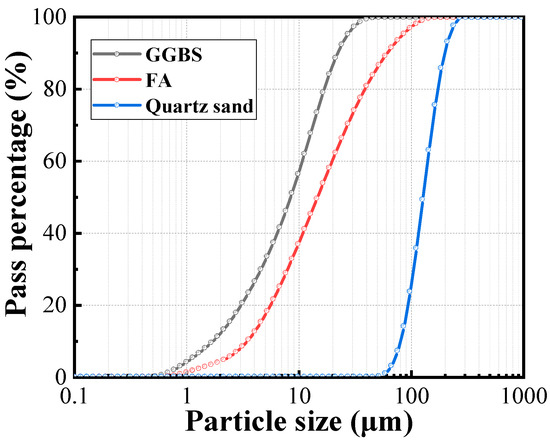 In this study, EGC was composed of FA, GGBS, alkali activator, quartz sand, retarder, water, and fiber. FA and GGBS, processed by Henan Hougang Co., Ltd., Zhengzhou, China, were used in accordance with the Chinese standard GB/T 18046-2017 [42], and their chemical compositions are presented in Table 1. The particle size distributions of the precursors and quartz sand are shown in Figure 2. The activator solution was prepared by mixing 10 M SH, processed by XiLONG SCIENTIFIC Co., Ltd., Guangzhou, China, with SS solution from Jiashan County Yourui Refractory Materials Co., Ltd., Jiaxing, China, thus achieving a modulus of 2.3. Quartz sand was used as the fine aggregate, with an average particle size of approximately 100 μm and a D50 of 126 μm. BaCl2 was used as a retarder to prolong the setting time of the fresh matrix. BaCl2 not only delayed the hydration of GGBS, thereby prolonging the setting time, but also enhanced workability [43]. The physical parameters of the PE fiber are listed in Table 2.