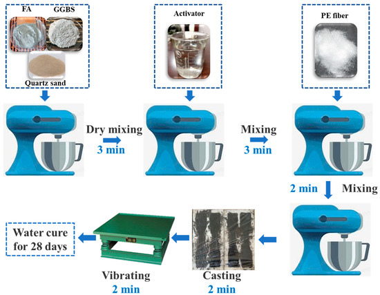The mixing process is illustrated in Figure 3. Dry ingredients (FA, GGBS, sand, and retarder) were mixed for 2 min at the beginning of the mixing process. Following the dry mixing, the premixed and cooled activator solution was incorporated into the mixture. The combined materials were stirred for 3 min at 75 rpm to achieve a homogenous and flowable geopolymer matrix. PE fiber was then uniformly added and mixed for 3 min. This was followed by an additional 3 min of mixing to achieve a uniform and homogenous EGC. The freshly mixed EGC was promptly cast into molds and vibrated on a vibrating table for 2 min to eliminate entrapped air bubbles. To prevent the formation of shrinkage cracks and slow down moisture loss, all specimens were sealed with plastic film upon casting and remained indoors for 24 h. After demolding, the specimens underwent water curing for 27 days.