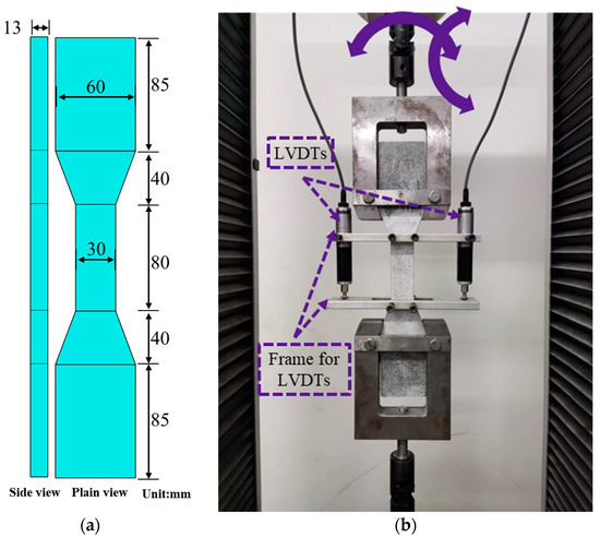 Test setup of direct tensile test: (a) Tensile test specimen size. (b) Tensile test specimen size.