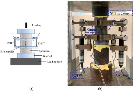 Cylindrical specimens (φ50 mm × 100 mm) from each of the five mixtures (three per mixture) were subjected to static compressive tests using a 5000 kN capacity universal test machine. The tests followed the ASTM C39/C39M-23 [46] and the elastic modulus according to ASTM C469/C469M-14 [47], thus employing a displacement controlled mode at 0.2 mm/min. To measure longitudinal strain during compressive testing, two strain gauges were affixed on opposite sides of the specimen’s center. Additionally, two LVDTs were installed on both sides. Before the test, the specimens were leveled with high-strength gypsum. The experimental setup is shown in Figure 5.