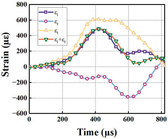 where Eb, Ab and Cb represent the elastic modulus (MPa), cross-sectional area (mm2), and longitudinal wave velocity (m/s) of the bar, respectively. A0 and l0 represent the cross-sectional area (mm2) and thickness (mm) of the test specimen, respectively. Sample tests confirmed stress equilibrium, thus fulfilling the uniformity assumption (Figure 7).