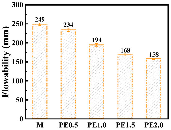 The results of the flowability tests conducted on all mixtures are depicted in Figure 8, thereby illustrating a gradual decrease in the slump flow of the fresh geopolymer pastes as the PE fiber content increased. The slump flow of the mixtures was significantly impacted by the PE fiber content. When the PE fiber content was low, the distance between the fiber in the paste was relatively large, thus making it difficult for the fiber to overlap and aggregate. However, with an increase in the PE fiber content, the likelihood of fiber overlap and aggregation between the fiber increased, thereby leading to increased internal flow resistance caused by fiber bridging [50]. Furthermore, related studies [51] have indicated that the mixing process promotes the formation of a water film around the PE fiber, thus reducing the available lubrication water and contributing to the observed decrease in the slump flow of the geopolymer paste.