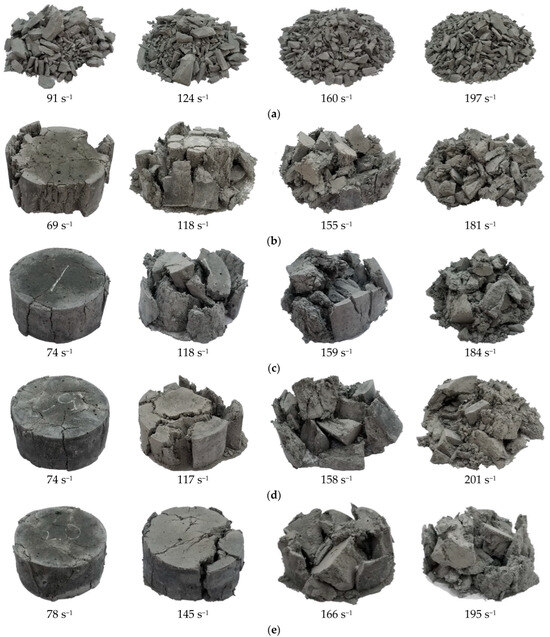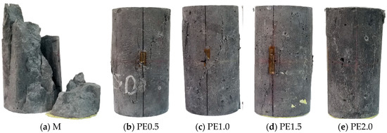 Failure patterns of all mixtures under impact loadings: (a) M, (b) PE0.5, (c) PE1.0, (c) PE1.0, (d) PE1.5, (e) PE2.0.