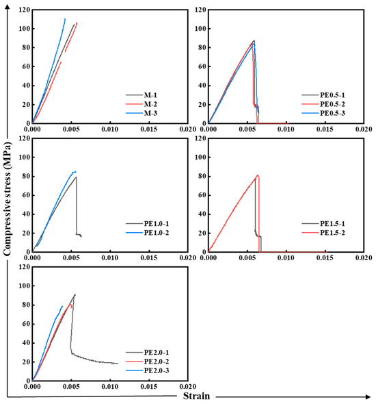 The stress–strain response of all the mixtures after quasistatic testing is shown in Figure 10. It can be observed from Figure 10 that all mixtures exhibited brittle failure. Due to the specimens’ brittle failure, data from the descending portion of the curves were unavailable. In the initial loading stage of the specimens, the stress and strain changed proportionally, thus approaching a straight line indicating the predominant role of the geopolymer matrix at this stage. After reaching the ultimate axial compressive strength, the stress of the Group M specimens sharply dropped, thereby indicating the loss of load-bearing capacity. Upon the addition of PE fiber, the stress also sharply declined after reaching the peak value. As the fiber content increased further, the bridging effect of the fiber strengthened, thus resulting in some residual strength in the specimens.