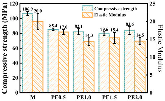 As shown in Figure 11, the PE fiber content influenced the compressive strength and elastic modulus of the EGC subjected to static axial compressive loading. The static compressive strength of the reference mixture (Group M) was 109 MPa. The compressive strength of the specimens showed a significant decrease as the PE fiber content increased. Compared to the reference mixture, PE2.0 displayed a 22% decrease in compressive strength. Overall, the compressive strength of the EGC decreased as the fiber content increased, which is consistent with previous research [53]. A similar decreasing trend was observed in the elastic modulus as in the compressive strength. Compared to the reference mixture, the elastic modulus of all the fiber-containing mixtures decreased by 15.0% to 28.5%. The decrease in both the compressive strength and elastic modulus was likely due to the impact of fiber on the mixture’s flowability. This led to fiber overlap and aggregation, which reduced the density of the geopolymer matrix [8]. Consequently, the overall compressive strength and elastic modulus of the geopolymer material decreased [54]. Moreover, due to the hydrophobic nature of the PE fiber and its differing bonding properties with the matrix, it may not have effectively enhanced compressive strength. Therefore, a decrease in the compressive strength of the EGC relative to the M matrix was observed, thus ranging from 20.1% to 25.5%.