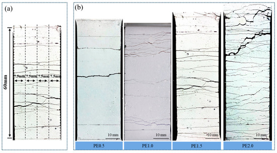 Figure 12b illustrates the typical tensile failure modes of the EGC with fiber contents ranging from 0.5% to 2.0%. The reference concrete displayed a failure mode characterized by single crack propagation, thus indicating brittle fracture characteristics. Thus, the discussion primarily centered on the failure modes observed in the EGC specimens containing fiber. Since not every crack traversed the entire specimen in its entirety, some of the cracks may be present in only a portion of the width of the specimen. Therefore, in this study, in order to have a more accurate count of the number of cracks in the specimen, the number of cracks that crossed the four equidistant lines in the transverse direction of the specimen were counted and averaged to obtain the number of cracks in each specimen, as shown in Figure 12a. In addition, in order to avoid the interference of the displacement gauge fixture on the crack observation, this study reported the number and width of cracks in the 60 mm observation section in the middle of the specimen. Finally, the average number of cracks for three specimens of each mixture was reported. The crack widths were calculated based on the number of cracks, as well as the deformation of the scale length, at which time it was assumed that the matrix deformation was negligible [22]. From Figure 12b and Table 4, it can be observed that the number of cracks in the specimens gradually increased, which is consistent with the trend of fiber content variation. PE 2.0 exhibited the greatest tensile strain capacity among all the mixtures and also had the greatest number of cracks. The average crack number increased by 314.0% and 96.6% when the fiber content increased from 0.5% to 1.0% and 1.5%, respectively, but it only increased by 12.9% when the fiber content increased from 1.5% to 2.0%. From this, it can be inferred that the ability of further increasing the fiber content from 1.5% to induce cracks decreases significantly. There was a gradual decrease in the average crack width as the fiber content increased from 0.5% to 1.0% and 1.5%. Compared to PE1.5, the average crack width in PE2.0 increased by 4.1 μm, but it only increased by 2.7%. Overall, as the fiber content increased, the number of fibers at both ends of the crack increased, and so did the fiber bridging capacity [53].