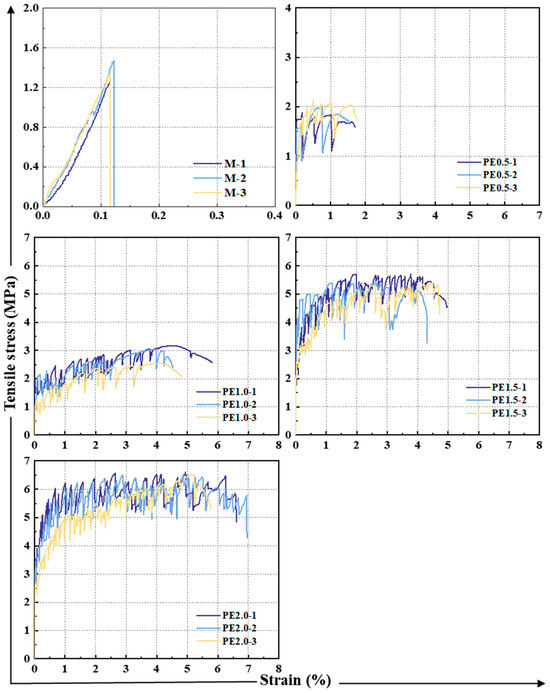 The stress–strain curves for all mixtures are depicted in Figure 13. All EGC samples, except for the reference mixture M, exhibited strain-hardening behavior under tensile loading. In contrast to its compressive behavior, the tensile properties of the EGC, including tensile strength and ultimate strain, gradually improved with increasing fiber content. PE1.0 exhibited a tensile strength of 2.90 MPa and an ultimate strain of 4.26%. A significant strain-hardening stage was observed during which cracks continuously initiated and propagated, thus leading to noticeable fluctuations in the stress–strain curve. When the fiber content increased to 1.5%, the tensile strength of PE1.5 reached 5.63 MPa, with an ultimate strain of 4.70%. This represents an increase of 94.1% and 10.3%, respectively, compared to PE1.0. Additionally, the tensile strength and ultimate strain of PE2.0 were 10.1% and 16.0% higher, respectively, than those of PE1.5. As the number of cracks increased, the stress–strain curve also exhibited more fluctuations. As the fiber volume fraction increased, the fiber reinforcement index (Vf Lf/df) of PE0.5, PE1.0, PE1.5, and PE2.0 increased from 2.50 to 5.00, 7.50, and 10.0, respectively, thus significantly enhancing the tensile performance of the EGC. Due to the inherent hydrophobicity of the PE fiber, the interface adhesion between the fiber and the matrix was mainly achieved through friction. As the fiber content increased, this mechanism facilitated an increase in the number of fiber bridging cracks, thereby ultimately resulting in the enhancement of the tensile strength of the EGC [53].