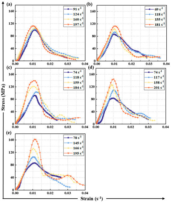 Dynamic compressive stress–strain curves under different strain rates: (a) M, (b) PE0.5, (c) PE1.0, (d) PE1.5, (e) PE2.0.