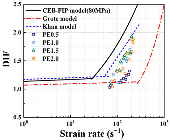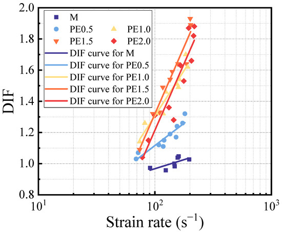 As shown in Figure 17, the DIF of the specimens exhibited a strain rate-dependent increase. Worthy of note was the significant increase in the strain rate sensitivity of the geopolymer concrete observed upon the addition of fiber, irrespective of the fiber content. In comparison to the reference mixture, the slope of the DIF for PE0.5 increased from 0.232 to 0.570, while for PE1.0, the slope increased to 1.16, thus emphasizing once again the important role of fiber in strain rate sensitivity. When explaining the reasons for the strain rate sensitivity, the lateral inertial effect was widely considered as a significant factor [59,60,61]. The addition of PE fiber provided additional resistance to concrete crack propagation, thus increasing the strain rate sensitivity. Similar phenomena have also been observed in geopolymer concrete reinforced with PVA fiber, where the presence of PVA fiber increased the DIF by more than 3.56 times compared to ordinary geopolymer concrete [33,38,55].