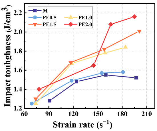 Figure 18 illustrates the impact of the PE fiber volume fraction on the dynamic impact toughness under various strain rates. An overall increase in the specimens’ impact toughness to impact was observed with an increasing strain rate. Figure 16 shows that the impact toughness of the specimens generally increased with the increase in the strain rate. For example, when the strain rate was increased from 74 s−1 to 158 s−1 and 201 s−1, the impact toughness of PE1.5 increased by 40.0% and 54.6%, respectively. This observation indicated the strain rate sensitivity of both the reference concrete and the EGC. Across all strain rates, specimens containing PE fiber exhibited higher dynamic impact toughness compared to the reference concrete. It was further observed that the impact toughness of PE0.5 displayed a close resemblance to that of the reference concrete, while the impact toughness of PE1.0 demonstrated a similar level of toughness to PE1.5. This was attributed to the bridging of cracks by the PE fiber during crack propagation, thus leading to debonding, sliding, or pull-out behavior, as well as increasing the energy absorption capacity and enhancing the specimen’s impact toughness. Moreover, considering the diameter of the PE fiber, even with only a 1% volume fraction, there was still enough fiber present in the concrete to form a grid [62]. Hence, there was little difference in the impact toughness between PE1.0 and PE1.5. At low strain rates (<90 s−1), the specimens with PE fiber ranging from 0.5% to 1.5% in volume exhibited similar dynamic impact toughness values. The application of higher strain rates resulted in more extensive damage to the specimens, which was characterized by an increased number and size of cracks, elevated peak strain values, and a marked improvement in the energy absorption capacity exhibited by the fiber [63]. Therefore, under highly damaged conditions, the fiber with higher volume fractions could absorb more energy, with PE2.0 exhibiting the maximum impact toughness. Additionally, PE2.0 demonstrated the highest compressive strength exhibited under high strain rate loading conditions, which also contributed to its maximum impact toughness.