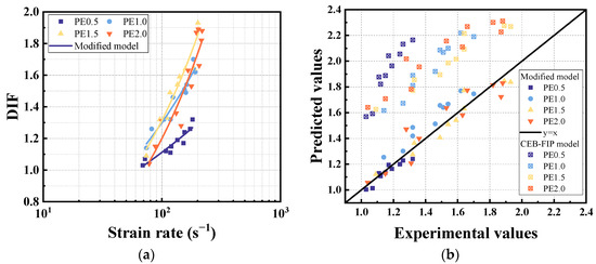 Verification of the proposed DIF model: (a) Modified model results of the DIF at different strain rate show good agreement with test results; (b) calculation versus experimental values.