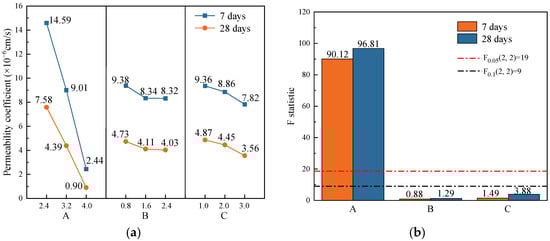 - A reasonable quality ratio for this high-efficiency cement-based capillary crystalline grouting material is water/cement/PNC803/sodium sulfate/calcium chloride/TIPA = 1:1:0.032:0.016:0.03:0.00075. Its viscosity is 164 mPa∙s, its bleeding rate is 4.4%, and the initial setting time and final setting time are 402 and 804 min, respectively. The permeability coefficients of the grouted materials at 7 and 28 d are 7.06 × 10−6 and 3.08 × 10−6 cm/s, respectively. The compression strengths of the hardened grout at 3, 7, and 28 d are 7.62, 10.63, and 14.78 MPa, respectively.