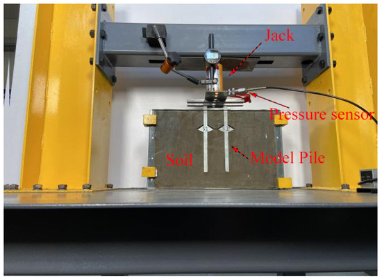 Prior to this study, large-scale pile soil solid tests and a large number of laboratory small model tests were conducted at a construction site [14]. The laboratory small model tests mainly used a reaction loading platform device as shown in Figure 2. The reaction loading platform primarily comprised a reaction beam, a pull-out instrument, and a displacement sensor, which uses the reaction beam to apply downward pressure. When the experimental and ANSYS simulation data were compared and analyzed, the results were basically consistent, confirming the accuracy of using ANSYS software to simulate and analyze the data in this study in order to examine the compressive bearing performance of CEP groups. A mapping method was used for grid division of the pile soil model, and the contact type required between the rigid and flexible bodies was identified. Grid refinement was applied to the bearing plate, though grid refinement was not required for the less affected pile body and pile soil [15,16,17]. Vertical surface loads were gradually applied to the model piles. The pile spacing was selected as the sole variable, and graded loading was applied to three different pile spacing (two to four times the overhanging diameter) models under four-, six-, and nine-pile situations [18]. The top displacement of each stage of the pile and the failure state of the soil around the pile were recorded using ANSYS software under a vertical load, and relevant displacement cloud maps were extracted to analyze the bearing performance of the pile, the changes in the soil around the pile, and the pile–soil effect under different pile spacings [19]. A comparative analysis of the stress conditions of corner, edge, and center piles was conducted. The research results obtained fill the gap in the literature on the compressive capacity of CEP pile groups. They provide a theoretical basis for the practical application of CEP groups in engineering.
