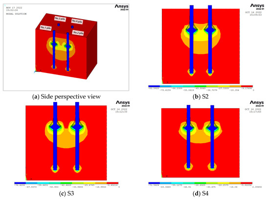 (2) Comparing the displacement cloud maps of the front and middle rows of piles, when the pile spacing is the same, the soil influence range of the profile map of the front row of piles is significantly smaller than that of the middle row of piles, and the displacement range of the soil around the piles gradually decreases from inside to outside. This indicates that the soil overlap range between the center pile and adjacent piles is larger than that between the edge and corner piles, resulting in a slightly smaller bearing capacity of the soil around the middle pile than that of the edge and corner piles. (3) The corner piles (Pile 1) and edge piles (Pile 4) of each group show that the soil displacement range of the edge piles is slightly larger than that of the corner piles, and this phenomenon gradually decreases with an increase in pile spacing. When the pile spacing increases to four times the cantilever diameter of the plate, the displacement difference between the corner, edge, and center piles is small and can be ignored. Therefore, when limited by the site, it is more reasonable to control the pile spacing by three to four times when the plate is suspended.