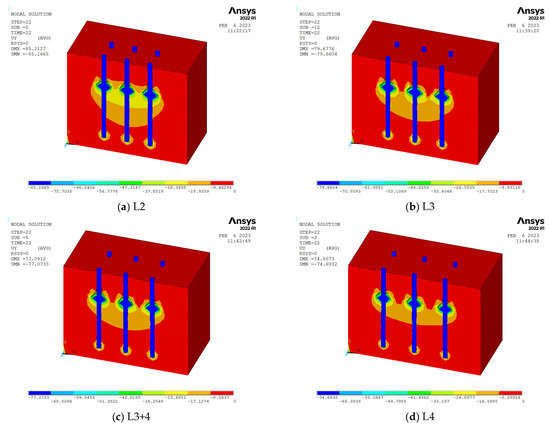 Figure 6. Cloud diagram of displacement for each group under ultimate load of L2–L4.