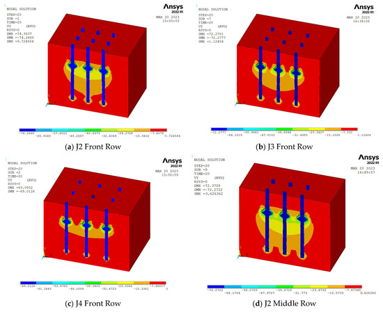 The displacement cloud map of the front row piles of the six-pile model under ultimate load was extracted for comparative analysis, as shown in Figure 6.