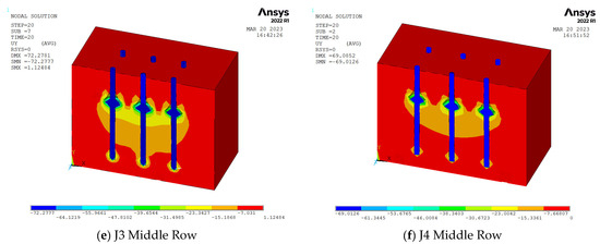 (1) Under the same load, the displacement cloud maps of the front and middle rows of the three pile spacing groups are basically consistent. As the pile spacing increases, the influence range of the soil around the pile gradually decreases, which is consistent with the mechanism of pile group action.