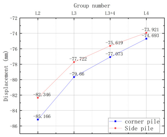 For six piles, four sets of simulated displacement values of the corner and edge piles were extracted under the ultimate load, and displacement curves were drawn, as shown in Figure 8.