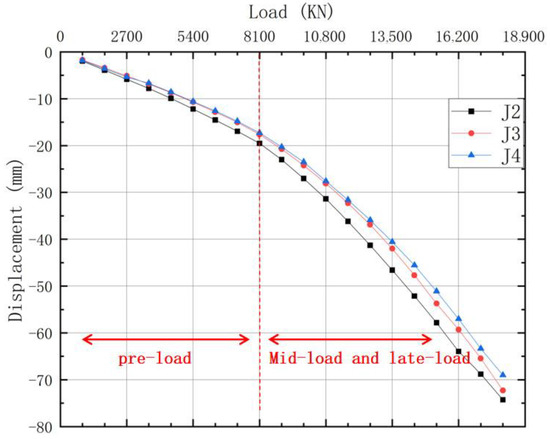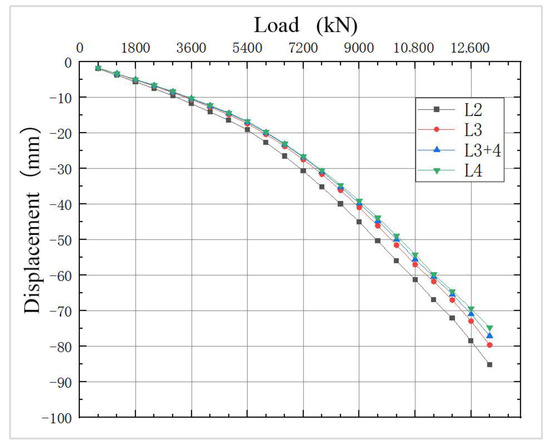 The center pile with the largest displacement among the nine piles was considered as the research object. The displacement curves of the pile top under different loads were plotted, as shown in Figure 11.
