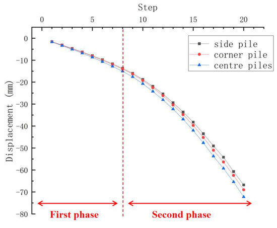 In the case of nine piles, the pile top displacements of the representative J3 group corner, edge, and center piles (Piles 1, 2, and 5 in Figure 4) at asynchronous levels were extracted, and a curve graph was drawn, as shown in Figure 10.