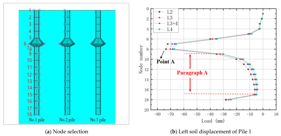The displacement values corresponding to each node of the six piles under the ultimate load were extracted, the node was selected, as shown in Figure 12a, and three groups of curves were drawn according to the displacement value of the soil node on each side, as shown in Figure 12b–d.