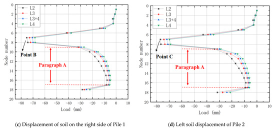 (2) The maximum displacement of the soil on the left side of Pile 1 in Figure 12b is at Node 8 of Group L2 (Point A in the figure), with a displacement value of −73.51 mm. The corresponding displacement values of the other three groups of Node 8 are −70.19, −68.51, and −67.23 mm. The maximum displacements of the soil in Groups L3, L3+4, and L4 decrease by 4.52%, 6.8%, and 8.54%, respectively, compared with the maximum displacement of Group L2. Similarly, on the right side of Pile 1 and left side of Pile 2, the maximum displacement is at Node 7 (Points B and C in the figure). Node 7 is located at the midpoint below the plate, with the displacement values at Points B and C being −75.31 and −77.02 mm, respectively. As shown in Figure 12c, the maximum displacements of the other three groups relative to Point B decrease by 3.19%, 6.37%, and 9.23%, respectively. Similarly, as shown in Figure 12d, the maximum displacements of the other three groups relative to Point B decrease by 3.6%, 6.65%, and 9.47%, respectively. Comparing the soil displacements on the side of the pile at three different positions reveals that the displacement of the soil on the inner side of the pile is slightly greater than that on the outer side. The reason is that because of the compression of the soil between piles and the effect of pile groups, the displacement of the soil in the inner side of the pile body will be slightly larger than that in the outer side. In practical engineering, it is possible to increase the spacing between the piles appropriately to reduce the soil effect on the inside of the piles. When the net spacing between the piles exceeds four times the overhang length of the plate, the improvement in the bearing capacity is negligible. At this time, it is not advisable to continue increasing the spacing between piles.