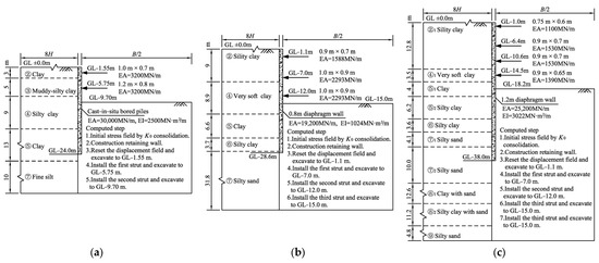 Reinforced concrete struts were used in these excavations. The elevation and cross-sectional dimension of the reinforced concrete struts are shown in Figure 1. Cast-in situ bored piles, a 0.8 m thick diaphragm wall and a 1.2 m thick diaphragm wall were applied as retaining walls in case I, case II and case III, respectively. The insertion ratios of case I, case II and case III were 1.47, 0.91 and 1.09, respectively. Figure 1 presents the typical cross-section of case I, case II and case III. More details of case I and case II were reported by Zhang et al. [27] and Gu et al. [28], respectively.