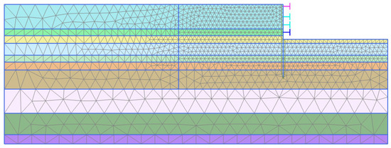 Combined with the engineering geology conditions and support parameters of case I, case II and case III, a series of numerical models with different excavation widths were carried out by Plaxis. A plane strain condition was assumed for the numerical analyses in this study. Figure 1 presents the basic model employed in this study. Considering the geometrical symmetry of the models, only half of the models were conducted for the following analysis. To reduce the influence of boundary effects, the distance from the left boundary to the retaining wall was 8H, and the distance from the bottom of the model to the excavation’s bottom was 3H. The left and right sides of the boundary were constrained horizontally, and the bottom boundary was restrained by both horizontal and vertical displacements. For each case, the excavation width B was taken as 1H, 2H, 3H, 4H, 5H, 6H, 7H, 8H, 9H and 10H. In total, 30 numerical models were utilized. The analysis processes of case I, case II and case III are shown in Figure 1. The diaphragm walls were assumed to be linear elastic, and bar elements were used for the struts. The soil was modeled by 15-noded triangular elements. Meshing of the typical model is shown in Figure 2. The bottom of the model was constrained from moving both horizontally and vertically, the left and right sides of the model were constrained from horizontal displacement, and the top of the model is a free boundary. Plastic calculation was selected during the analysis, which do not need to take the change in pore pressure with time into account.