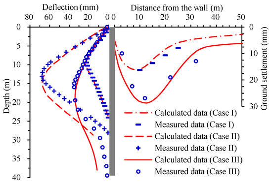 Figure 3 plots the computed data and measured data of case I, II and III after the completion of the excavation. The computed data and the measured data of case I and II are from Zhang et al. [27] and Gu et al. [28], respectively. For case I, the computed retaining wall deflections and ground surface settlements are in accordance with the measured data. As for case II, most of the computed deflections are close to the measured data except for the locations below the final excavation depth. For case III, most of the computed deflections are well consistent with the measured data, and only the computed data beneath the excavation face are slightly larger than the measured value. The computed ground surface settlements are in agreement with the measured data. The good agreement of the computed data and the measured data indicates that the constitutive models, the numerical model and Input parameters for the soil and structures adopted in this study are reasonable.