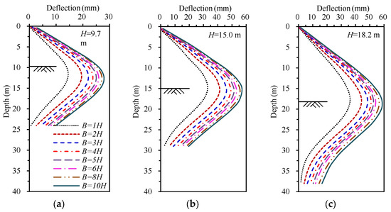 Figure 4. Variation in retaining wall deflections with excavation widths. (a) Case I; (b) case II; (c) case III.