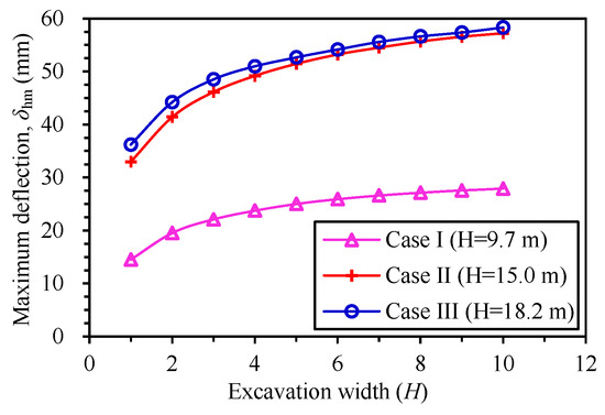 Figure 4 illustrates the development of the retaining wall deflections with excavation width (B) after reaching the final excavation depth (H). Figure 5 plots the relationship between the maximum wall deflection (δhm) and excavation widths. Generally, the deflections of the retaining wall gradually increase with the increasing excavation width. While B ≤ 4H, the deflections increase rapidly with the increasing excavation width. When 4H < B ≤ 8H, the deflections of the retaining wall still increase with increasing excavation width, but the increasing rate gradually decreases. While B > 8H, the increasing rate of the wall deflections further reduces. Taking case II as an example, the maximum deflections with widths of 2H, 3H, 4H, 5H, 6H, 7H, 8H, 9H and 10H are 1.26, 1.40, 1.49, 1.56, 1.61, 1.65, 1.69, 1.72 and 1.74 times than that of 1H, respectively. The deflection variation rules, described above, of case I and case III are consistent with that of case II. This phenomenon indicates that the effect of the excavation width on retaining wall deformation is gradually reduced with the increasing excavation width. The smaller the excavation width is, the greater the influences of the excavation width on the deflections are. For three excavations with different final excavation depths, a dissimilar retaining structure and diverse geological conditions, the impacts of the excavation width on the deflection of the retaining walls are comparable.