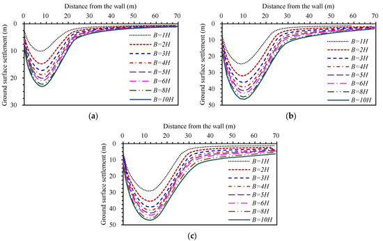 Figure 6. Variation in ground surface settlements with excavation width. (a) Case I (H = 9.7 m); (b) case II (H = 15.0 m); (c) case III (H = 18.2 m).
