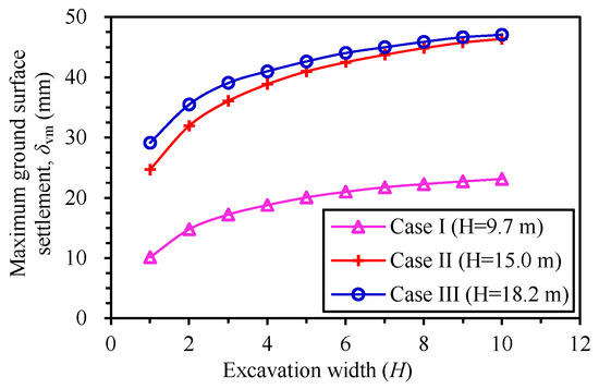 Figure 7. Relationship between the maximum ground surface settlement and excavation width.