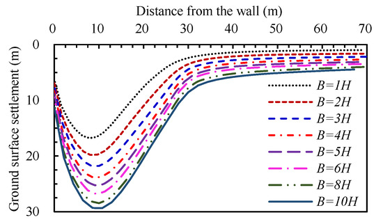 Figure 9. Variations in the ground surface settlements with excavation width.