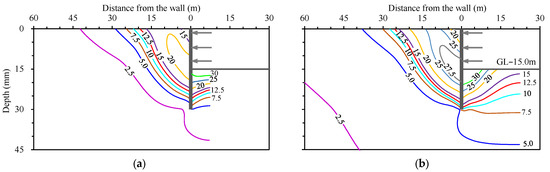 Figure 13 shows the variation in the basal heaves with the excavation width. The excavation width has a significant effect on the performance of the basal heaves. When the excavation width is small, the maximum basal heave is located in the middle of the excavation’s bottom. When the excavation width is large, the maximum basal heaves are on both sides of the excavation’s bottom near the retaining wall. This phenomenon is consistent with the conclusion of Xiao et al. [8]. For different width excavations, the maximum basal heaves are close. The maximum basal heaves of B = 1H, B = 3H and B = 7H are about 33 mm, 27 mm and 27 mm below the ground level, respectively. Moreover, the depths of the 9 mm heave contour for different widths of the excavation range from GL −25 to GL −30, which does not vary significantly with the excavation width. However, the maximum unloading influence depths attributable to the excavation are quite different. The maximum unloading influence depth can be reflected by the variation in the 3 mm contour. The depths of the 3 mm heave contour of B = 1H, B = 3H and B = 7H are 38.1 m, 55.3 m and 57.6 m below the ground level, respectively. With the increasing excavation width, the maximum unloading influence depth gradually deepens with a decreasing rate. This interesting phenomenon indicates that the variation in the excavation width has little influence on the strong heave zone, but has a greater impact on the weak heave zone.