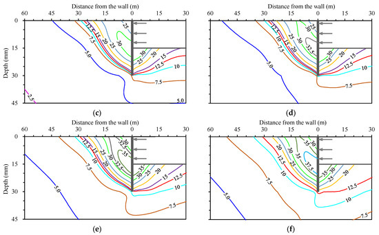 Figure 11. Contour maps of the total displacements (unit in mm) under different excavation widths. (a) B = 1H; (b) B = 3H; (c) B = 4H; (d) B = 5H; (e) B = 7H; (f) B = 10H.