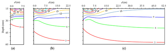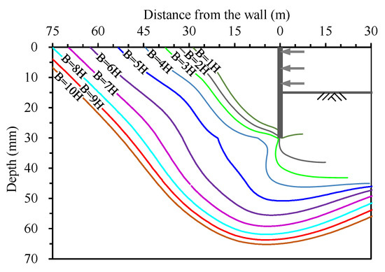 Figure 11 presents the contour of the total ground displacements under different excavation widths. With the increasing excavation width, the total ground displacements outside the excavation increase gradually. The larger the excavation width is, the greater the total ground displacements and the influence area are. After B ≥ 3H, the size of the triangular zone enclosed by the 12.5 mm contour, the ground surface and the retaining wall start to stabilize, although the whole influence area increases with the excavation width. Therefore, this triangular area can be defined as the strong influence zone during excavation.