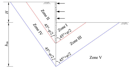 After excavation, the soil below the excavation surface transforms from the state at rest to the passive state, and the soil outside the excavation transforms from the state at rest to the active state. Combined with the development of the total displacements, the influence depth of the basal heaves, and the stress state of the soil around the excavation, the soil around excavation can be divided into five zones. Figure 14 shows the simplified zones around a large excavation width, where hm is the maximum unloading influence depth. Zones I and III are Rankine passive zones, and zones II and IV are Rankine active zones. Zone V is the rebound zone below the excavation’s bottom. The deformation of soil in zones I and II induced by excavation are the largest, and can be regarded as the strong influence zones. Correspondingly, the zones III and IV are the weak influence zones with less deformation. Through a K0 laboratory test, numerical analysis and engineering practice, Jia and Xie [5] suggested that the maximum unloading influence depth (hm) of the Shanghai soils is about 2.5 times that of the final excavation depth.