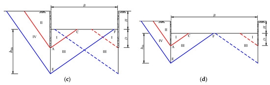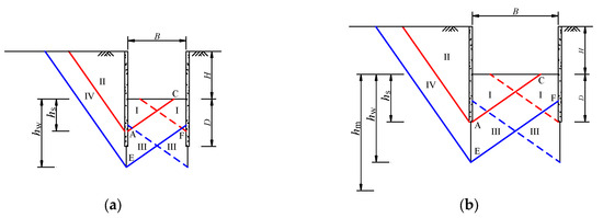 As shown in Figure 15a, when B < Dtan(45° + φ/2), zones I and III on both sides overlap with each other, and the potential sliding surface EF does not reach the excavation’s bottom. The value of hs is less than D, and the value of hw is much less than hm. In this instance, the soil of the passive zone has a strong restraining effect on the deformations of the retaining walls.