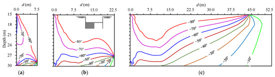 When B = H (Figure 16a), the |α| of most of the σ1 values beneath the excavation bottom is between 70° and 90°. The soil close to the center axis (d = 7.5 m) of the excavation has a large |α|. The soil beneath the excavation’s bottom is close to a completely passive state. The passive zone soil has a strong constraint effect on excavation deformations. When B = 3H (Figure 16b), the |α| within 7 m near the bottom is larger than 80°. As the depth and the distance from the retaining wall increases, |α| decreases gradually. In this case, the passive zone of the left and right sides is still overlapped. The constraint effect of the passive zone on excavation deformation is weaker than that of B = H. When B = 7H (Figure 16c), the rotation of σ1 mainly occurs within 45 m from the retaining wall. The direction rotation angle decreases rapidly with the depth and the distance from the retaining wall increases. When the distance between the soil and retaining wall is greater than 45 m, the |α| is close to zero. This indicates that the direction of σ1 is close to the vertical direction. In this case, the passive zone of the left and right sides beneath the excavation’s bottom no longer overlaps with the other. The constraint effect of the passive zone on excavation deformations is further reduced.