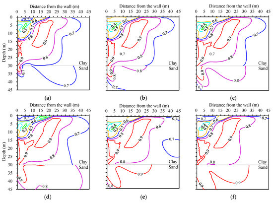 Figure 17. The relative shear stress of the soil behind retaining wall under different excavation widths. (a) B = 1H; (b) B = 2H; (c) B = 3H; (d) B = 4H; (e) B = 6H; (f) B = 8H.