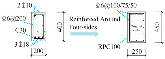 Based on the above research, this paper proposes a four-sided application of a reinforcing thin layer of reactive powder concrete (RPCTL). There are two main features of the reinforcement effect of RPCTL. First, the longitudinal reinforcement at the bottom of the beam is directly subjected to tensile force, and the tensile load capacity of the bending zone is improved by increasing the amount of reinforcement. Second, the deformation of the original members can be inhibited by restraining the concrete in the core area, thus improving the flexural stiffness [27]. Compared with three-sided applications, four-sided RPCTL reinforcement has a stronger restraining effect on the core zone, and the stress hysteresis effect is weaker than that of fiber composites or prestressing tendon reinforcements. The RPCTL has a smaller thickness, is lightweight and has a high strength, and provides greater reinforcement efficiency.
