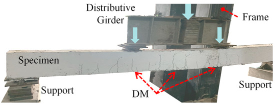 The original member was supported on hinged bearings at both ends, with a clear span of 4000 mm. The specimen was placed under a reaction frame, and a hydraulic jack was used to apply the force and loaded at two points in the middle of the top of the beam using a section distribution beam (Figure 3 and Figure 4). Displacement gauges were arranged at the bottom of the beam in the loaded mid-span section to read the deflection changes, and the loading was controlled by a hydraulic servo system to observe the cracks and deflection changes after stabilization under each level of loading. For specimens subjected to secondary loading, steel plates and wedges were used to tighten the gap between the reaction frame and the distributing beam immediately after the initial load was applied, thus maintaining the initial load level for subsequent reinforcement of the test beams.